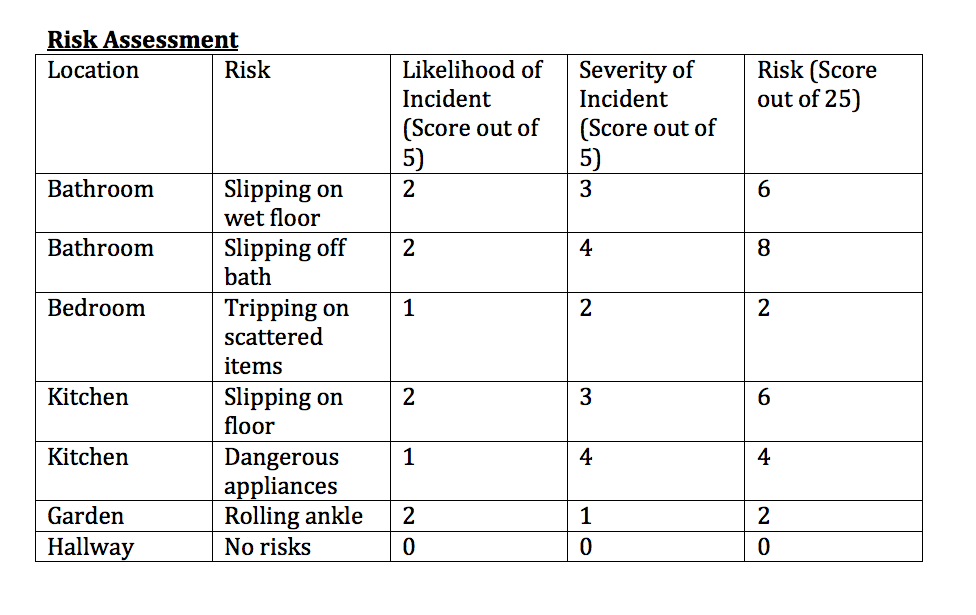 The risk assessment appears to be short but that is as the entirety of my short film is set inside or in the garden of a house. This means that there are not a great deal of risks that come with the filming of the project in contrast to if it had been set in a woods etc. I have tried to cover all potential risks such as sharp objects in the kitchen and wet surfaces in the bathroom despite these being very unlikely risks to the actors/myself.